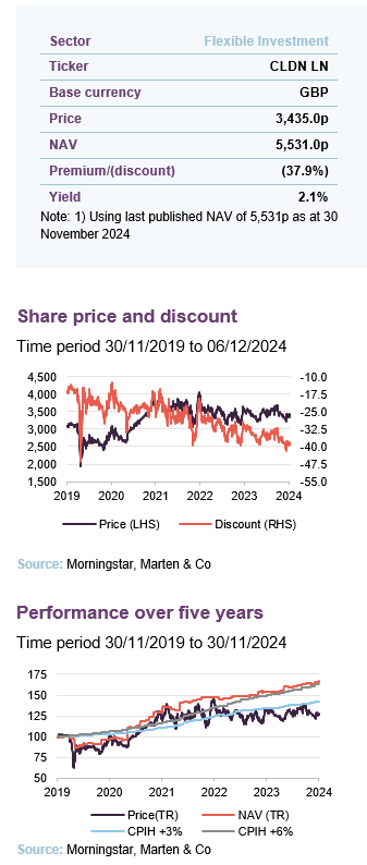 Over the 12 months ended 30 November 2024, CLDN’s discount moved within a range of 41.6% to 30.6% and averaged 35.4%. At 6 December 2024, CLDN was trading on a discount of 37.9%. The board and the managers feel that this discount is excessive and is not reflective of the quality of the portfolio or the trust’s long-term track record. We wholeheartedly agree with this.