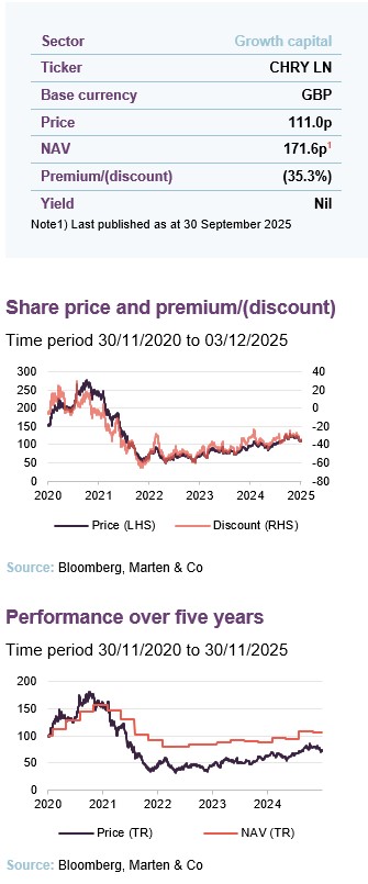 At the end of September 2025, CHRY’s NAV was 171.65p, up 9.6%% over 2025 as a whole. The initial fall in Klarna’s share price following its IP was captured in the end September NAV. However, adjusting for the move since might imply that CHRY’s NAV has fallen by a further 4p.