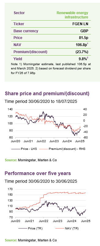 FGEN aims to provide its shareholders with a sustainable, progressive dividend, and to preserve capital values. It invests in a diversified portfolio of environmental infrastructure technologies, targeting projects characterised by long-term stable cash flows, secured revenues, and inflation linkage. Investment in these assets is driven by the need to address climate change and societal demand for sustainability.