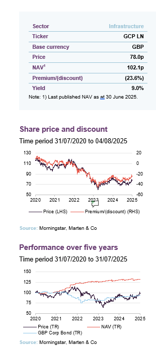 UK economic growth numbers have been weak, with a fall in GDP reported for May, following on from another monthly contraction in April. In such an environment, the predictable income provided by GCP might seem all the more attractive.
