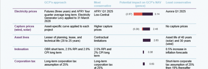 As in previous reports, we have included a table showing the impact of GCP’s conservative valuation assumptions on its NAV. The range shows what would happen to the NAV were GCP to adopt the most conservative or least conservative assumptions of peers when calculating its NAV. Whilst the sensitivity to power prices has fallen, it is still an important consideration. GCP uses the average of the last four quarterly power price curves produced by AFRY.