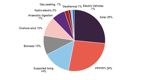In practice, GCP is diversified across a range of different infrastructure subsectors, although its focus has shifted more towards renewable energy infrastructure over the last few years. It has exposure to renewable energy projects (where revenue is partly subsidy and partly linked to sales of power), PFI/PPP-type assets (whose revenue is predominantly based on the availability of the asset), and specialist supported social housing (where local authorities are renting specially-adapted residential accommodation for tenants with special needs).