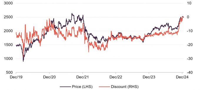 The last two months of 2024 saw heightened investor concerns surrounding the Labour Party’s budget – which raised fears of potential increases in capital gains taxes (an issue particularly for some longer-term investors who have booked significant gains over many years) – that increased the number of shares coming to market. HRI was able to step in and repurchase some of these, but was active in the market alongside Saba, which was also actively buying to increase the size of its holding in advance of launching its attack on the fund. The combined actions help drive the discount down, though Saba’s buying activities have been the overwhelming factor in recent weeks, with HRI’s shares trading at par value as of today.