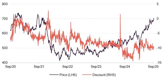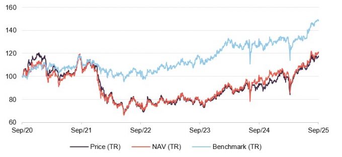 Over the 12 months to the end of September 2025, JFJ’s discount to NAV moved within a range of 14.4% to a 6.9%, averaging 10.4%. At the time of publishing, the discount was 9.0%.