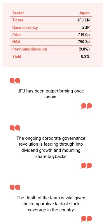 | Performance | The manager has positioned the portfolio to benefit from the economic change underway in the countryJapanese equities are under-owned | The manager suggests that a much weaker yen could have the effects of both weighing on sterling returns and flattering major exporters that JFJ does not own |
