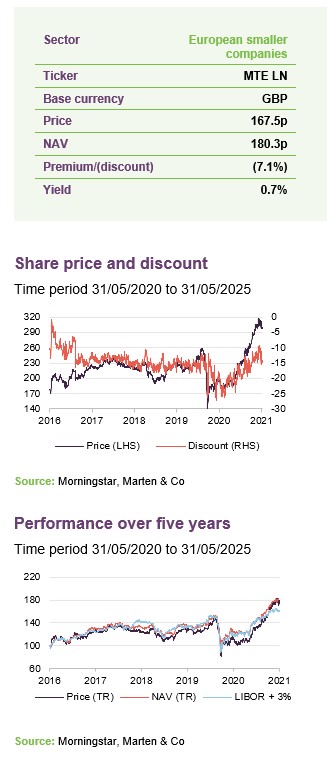 Source: Morningstar, Marten & Co. Note: MTE’s benchmark is the MSCI European Smaller Companies Index ex-UK. Listed peer group is European Assets, JPMorgan European Discovery, and The European Smaller Companies Trust.