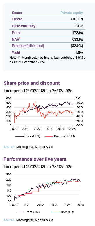 Over the 12 months ended 28 February 2025, OCI’s share price discount to NAV ranged between 34.5% and 25.6%, averaging 29.3%. At the time of publishing, the discount was 32.0%.