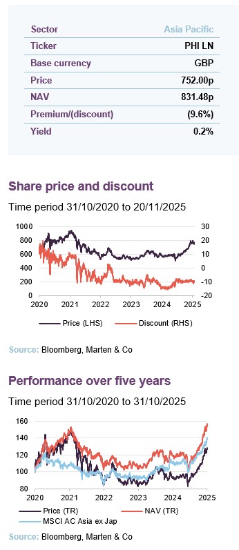 PHI’s performance was aided by timely decisions to decrease the exposure to China in 2021 in favour of India, and – as we discussed in our last note – to reallocate away from India into China in 2024. The latter move reflected a view that the Indian market was increasingly priced for perfection, while valuations in the Chinese market looked overly negative, even allowing for the challenges that the Chinese market was facing. This, along with a similarly early decision to increase exposure to semiconductors, has contributed significantly to PHI’s performance during the last year.