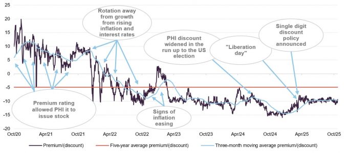 As explored further in the performance section on page 11, PHI exposure to AI and technology holdings have helped driving performance in recent months. In the semiconductor space, PHI has benefitted from its significant holdings in the likes of TSMC, Samsung. SK Hynix (which it also has exposure to through SK Square, which is a holding company for SK Hynix; the managers have shifted PHI’s exposure more into SK Square, reflecting the significant discount to NAV that it trades at) and EO Technics.