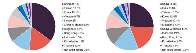 There has been no significant change in the themes represented in PHI’s portfolio since we last published, although the exposure to India has continued to fall in favour of China (in part, reflecting relative performance) – these being the two major shifts in geographical allocations – see Figures 3 and 4. However, while PHI’s managers had been actively increasing the exposure to China, they have also been trimming some Chinese names recently, taking advantage of the market movements to broaden the stock selection in China.