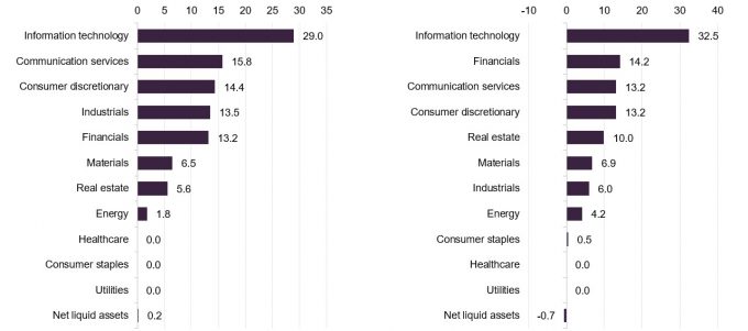 A comparison of the sector allocations shows that the most significant change is the increased exposure to industrials (up 7.5 percentage points), a notable increase in communication services (2.6 percentage points), and a smaller rise in consumer discretionary (1.2 percentage points). Real estate (-4.4 percentage points) and information technology (-3.5 percentage points) have seen the largest reductions, and there have also been meaningful reductions in energy (-2.4 percentage points), financials (-1.0 percentage points). All other changes are less than one percentage point.