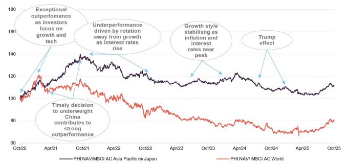 Figure 8: PHI’s total return NAV performance relative to its comparative benchmark (MSCI AC Asia ex Japan) and the MSCI AC World, over five years to 31 October 2025
