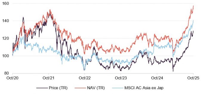 Figure 8: PHI’s total return NAV performance relative to its comparative benchmark (MSCI AC Asia ex Japan) and the MSCI AC World, over five years to 31 October 2025
