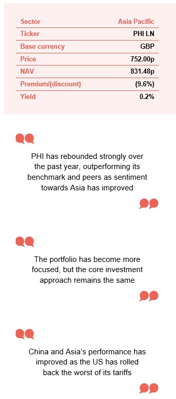 | Performance | Absolute performance has been positive over all time periods and PHI’s NAV total returns are top of its peer group for all periods, with the exception of three years – a period where inflation and interest rates have been elevated, particularly in developed markets. Inflation is edging up in the US, but the growth outlook has also deteriorated, limiting the capacity to raise interest rates, while China has also been recovering. PHI looks well-placed for further outperformance. | PHI has had a difficult few years of relative underperformance. This has largely been due to growth investing being out of favour against a backdrop of rising inflation and interest rates. Decisions to increase the exposure to China and semiconductors early in 2024 also weighed on PHI’s performance last year, but this has since reversed. |
