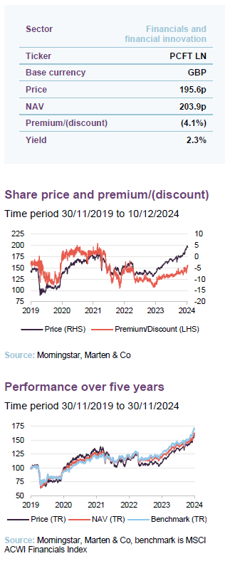 PCFT aims to generate a growing dividend income, together with capital appreciation. It invests primarily in a global portfolio, consisting of listed or quoted securities issued by companies in the financial sector. This includes banks, life and non-life insurance companies, asset managers, stock exchanges, speciality lenders and fintech companies, as well as property and other related sub-sectors.
