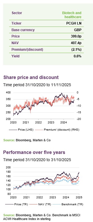 PCGH’s managers state that most large pharmaceutical companies have announced significant investments in US capacity, which they believe should mean that these companies are excluded from the 100% tariff policy. According to the managers, whilst there may be short-term downward pressure on earnings as a result of the MFN and tariff policies, greater visibility could, in time, lead to improved sentiment and higher multiples in the sector.