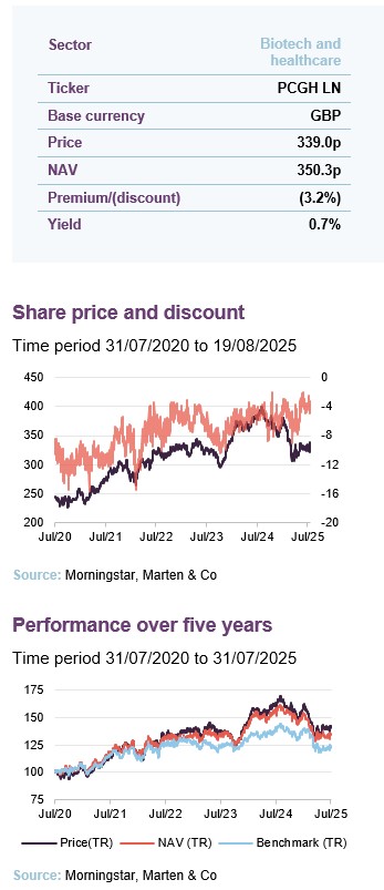 The gulf between the 12.5% return on the MSCI ACWI over the 12 months ended 31 July 2025 shown in the table on the front page of this note and the 13.0% fall in PCGH’s benchmark reflects, in part, investors’ continued fixation on mega-cap AI plays. However, there have also been a number of negative headlines affecting the healthcare sector and, as PCGH’s manager has highlighted, this has driven substantial outflows from both active and passive funds focused on this area.