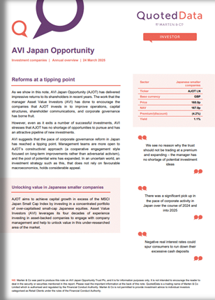 AVI suggests that the pace of corporate governance reform in Japan has reached a tipping point. Management teams are more open to AJOT’s constructivist approach (a cooperative engagement style focused on long-term improvements rather than adversarial activism), and the pool of potential wins has expanded. In an uncertain world, an investment strategy such as this, that does not rely on favourable macroeconomics, holds considerable appeal.