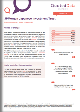 The JPMorgan Japanese Investment Trust (JFJ) is uniquely positioned to capitalise on these developments and has delivered a NAV total return of 21.2% over the past year; more than double the return of the TOPIX index. We believe this is just the tip of the iceberg, given the breadth of Japan’s structural economic transformation now occurring.