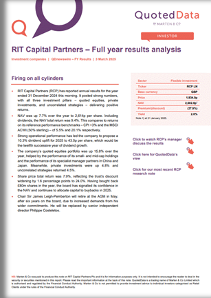 RIT Capital Partners (RCP) has reported annual results for the year ended 31 December 2024 this morning. It posted strong numbers, with all three investment pillars – quoted equities, private investments, and uncorrelated strategies – delivering positive returns.