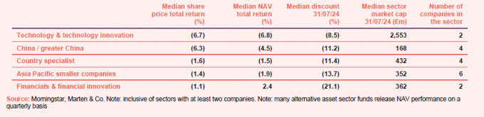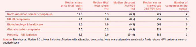 In terms of the best performing sectors, North American smaller companies benefited from a more broadly-based rally at the start of the month and held up better as the sell-off in highly rated tech stocks gathered pace. Amidst slowing inflation and subsequent hopes for rate cuts, investors may have directed their attention towards US small caps, at the expense of larger companies. That fed through into the performance of global small cap trusts. UK trusts and property companies did well, helped by the rate cut. The biotechnology and healthcare rally was driven by stock specific moves.