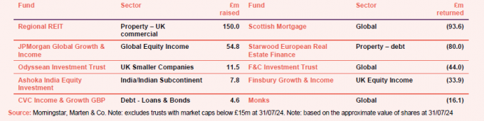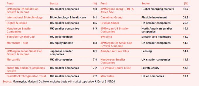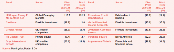 Best performing funds in total NAV (LHS) and share price (RHS) terms over July 2024