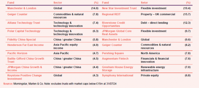 Worst performing funds in total NAV (LHS) and share price (RHS) terms over July 2024