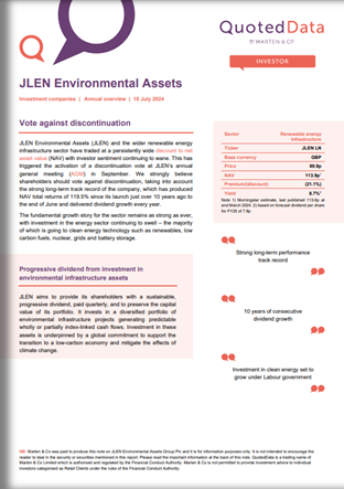 JLEN Environmental Assets (JLEN) and the wider renewable energy infrastructure sector have traded at a persistently wide discount to net asset value (NAV) with investor sentiment continuing to wane. This has triggered the activation of a discontinuation vote at JLEN’s annual general meeting (AGM) in September. We strongly believe shareholders should vote against discontinuation, taking into account the strong long-term track record of the company, which has produced NAV total returns of 119.5% since its launch just over 10 years ago to the end of June and delivered dividend growth every year.