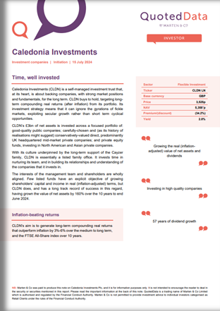 Caledonia Investments (CLDN) is a self-managed investment trust that, at its heart, is about backing companies, with strong market positions and fundamentals, for the long term. CLDN buys to hold, targeting long-term compounding real returns (after inflation) from its portfolio. Its investment strategy means that it can ignore the gyrations of fickle markets, exploiting secular growth rather than short term cyclical opportunities. CLDN’s £3bn of net assets is invested across a focused portfolio of: good-quality public companies; carefully-chosen and (as its history of realisations might suggest) conservatively-valued direct, predominantly UK headquartered mid-market private companies; and private equity funds, investing in North American and Asian private companies.