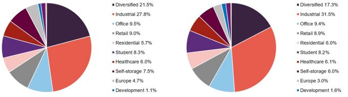 A breakdown of the property sub-sectors, illustrated in Figures 1 and 2, show that companies focused on industrial and logistics saw the largest gain in share of market capitalisation over the year, while diversified REITs were the main source for M&A hunters.