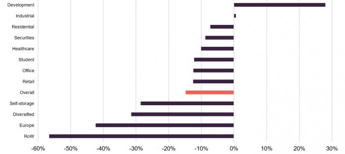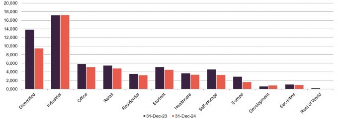 There were just two sectors that grew in 2024. The performance of the development category was skewed by the impressive gains of Harworth (detailed below). Share prices were generally down across the industrial and logistics companies, but two large mergers (by LondonMetric and Tritax Big Box REIT – both of diversified REITs) wiped out the losses. The rest of world sector, made up of a few funds focused on particular and relatively unrelated regions, was stricken by poor performance due to generally thin traded strategies with country specific issues