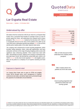 An update note on Lar España Real Estate (LRE SM), which has been the subject of an offer for the company. We look at the merits of the bid given the performance and prospects of the company.
