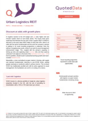 An annual overview note on Urban Logistics REIT (SHED). The company’s discount to NAV appears to be at odds with the growth potential of the portfolio.