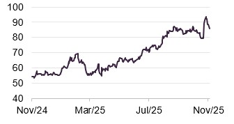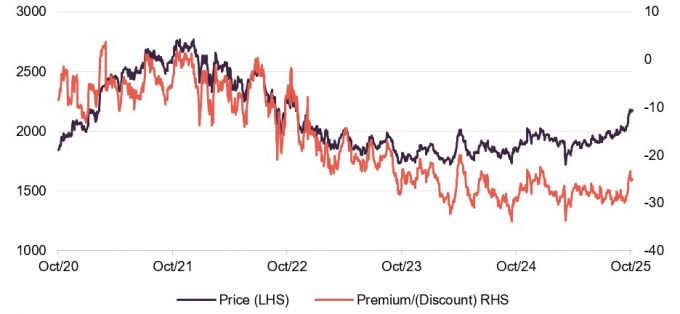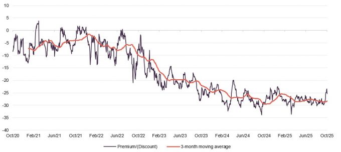 Over the 12-month period ending 31 October 2025, RIT’s shares traded between a 33.7% and a 22.5% discount. Over this period, the average discount was 27.6%. On 17 November 2025, the discount (to the end-October NAV) was 25.9% – just below the 12-month average.