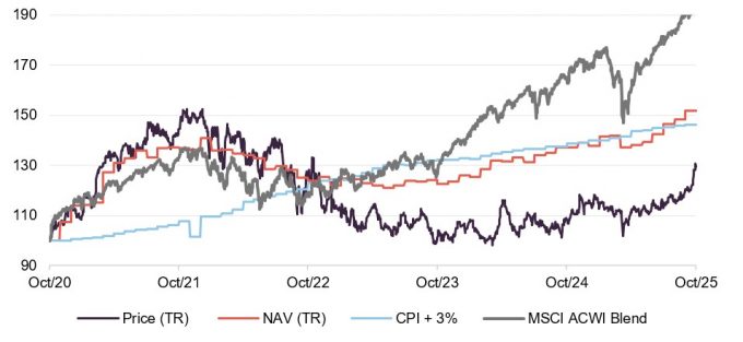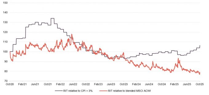 Over the past five years, RIT has beaten CPI inflation +3%, even as inflation rose sharply after COVID and stayed above central banks’ 2% target. However, it has lagged behind the blended MSCI ACWI benchmark, which is heavily weighted towards US tech stocks.