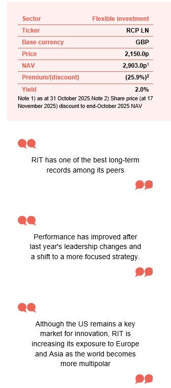 RIT’s private portfolio is mainly focused on technology, while its public portfolio follows strong investment themes. Although the US remains a key market for innovation, RIT is increasing its exposure to Europe and Asia as the world becomes more multipolar. The company looks to benefit from these changes by working with specialist managers.