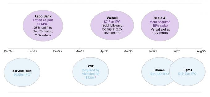 Around 60% of RIT’s directly held private portfolio was sold in the first half of this year, with further sales in its fund investments. Figure 1 shows the timeline of these realisations in 2025, with purple bubbles for direct holdings and blue for fund exits.