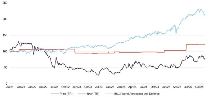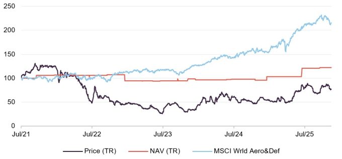SSIT aims for annualised NAV returns of 20% over the long term. While it does not have a formal benchmark, we have used the MSCI World Aerospace and Defence Index for comparison in this note, as does the company itself.