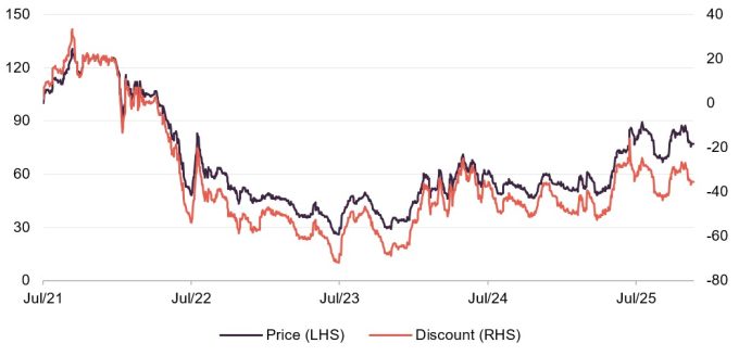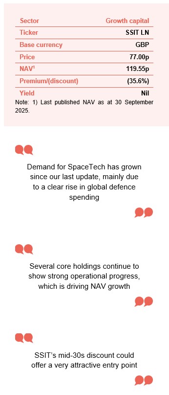 Although SSIT’s discount is still large, it has been narrowing gradually. Other growth capital funds also trade at wide discounts, but SSIT stands out due to its focus on space technologies and increased interest in defence spending. We believe the current discount is excessive given these factors.