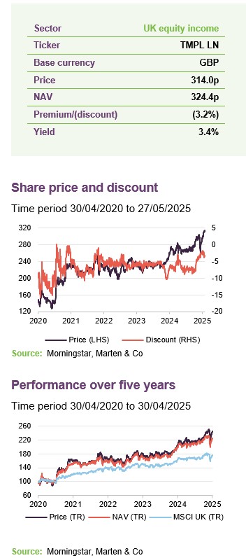 The past year has been a period of relative NAV outperformance for TMPL, with a more favourable share price performance reflecting a narrowing (and close to elimination) of the discount during the year.